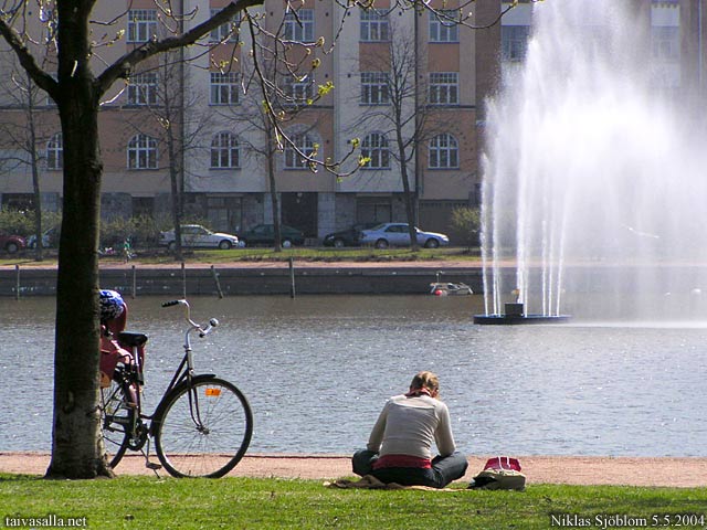 Helsinki: Lämmin tuokio Tokoinrannassa. Taustalla Eläintarhanlahden suihkulähde ja Säästöpankinrannan rakennuksia Siltasaaressa.
