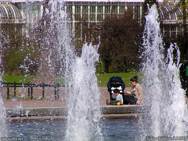 Helsinki: Lepohetki Kaisaniemen puiston suihkulähteiden äärellä. Taustalla Kaisaniemen kasvitieteellisen puutarhan pääkasvihuone. (Kasvihuone kuvattuna myös 16.10.2003.)