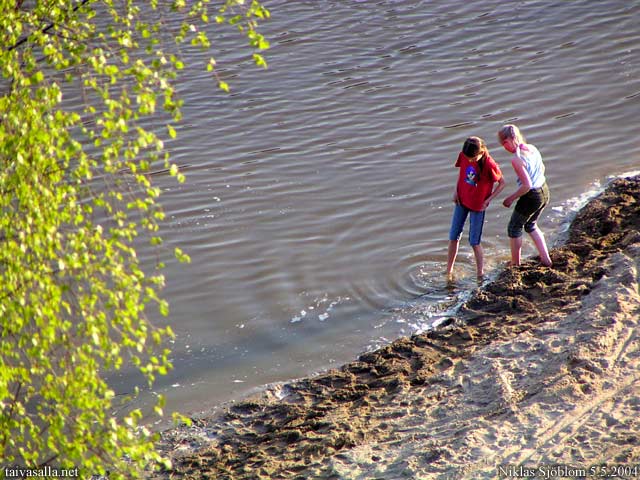 Helsinki: Tyttöjä leikkimässä Pikkukosken uimarannalla hetkeä ennen heidän pulahtamistaan Vantaanjoen rantaveteen.