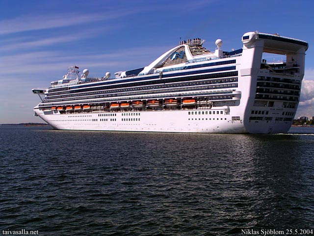 Helsinki: M/S Grand Princess, suurin kaupungissa vieraillut risteilyalus vuonna 2004, suuntaa merelle Länsisatamasta. Oikealla Lauttasaaren eteläkärkeä.