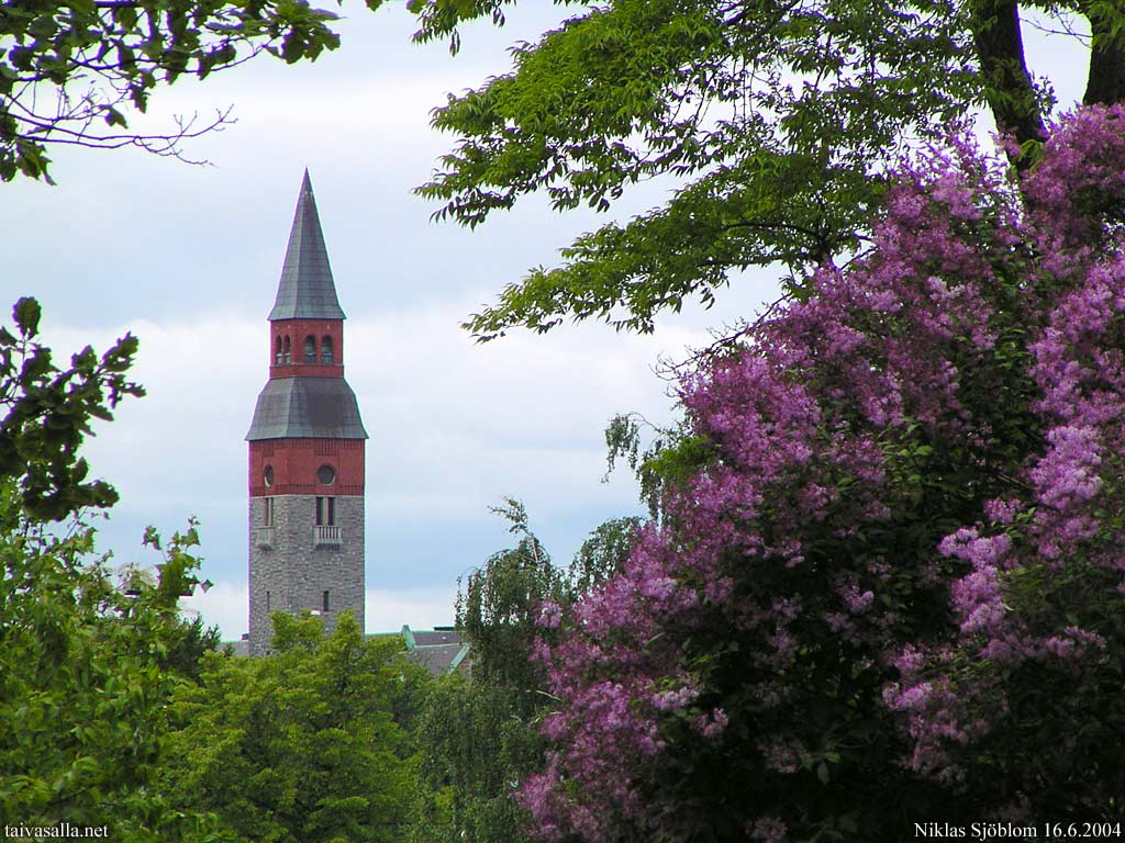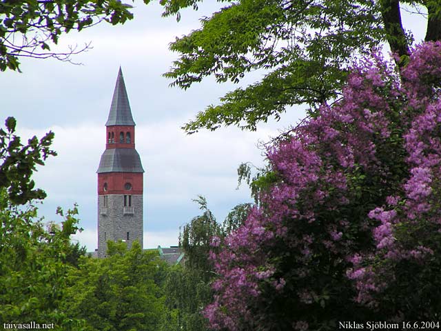 Helsinki: Suomen kansallismuseon torni nähtynä Kaisaniemen kasvitieteellisestä puutarhasta. Oikealla kukkii isabellansyreeni.