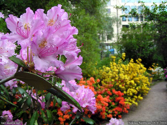 Helsinki: Alppiruusujen ja atsaleoiden kukoistusta Kaisaniemen kasvitieteellisessä puutarhassa. Taustalla rakenteilla oleva Kuntien eläkevakuutuksen tuleva toimitalo.