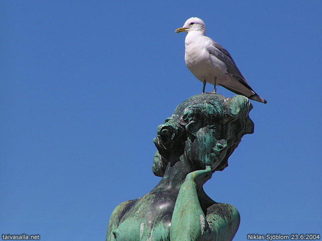 Helsinki: Lokki tarkkailee kesäisen kaupungin vilinää Havis Amandan päälaella Kauppatorilla.