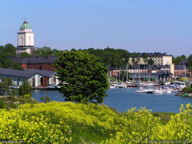Helsinki: Näkymä Varvilahdelle Suomenlinnan Länsi-Mustasta. Taustalla Iso Mustasaari ja Suomenlinnan kirkko/majakka.