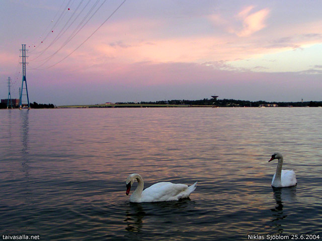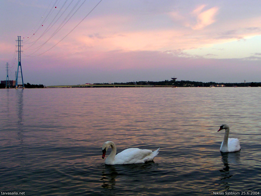 Helsinki: Kyhmyjoutsenpariskunta juhannusyössä Seurasaarenselällä. Näkymä Mäntyniemen ja Humallahden väliseltä rannalta kohti Lauttasaarta.
