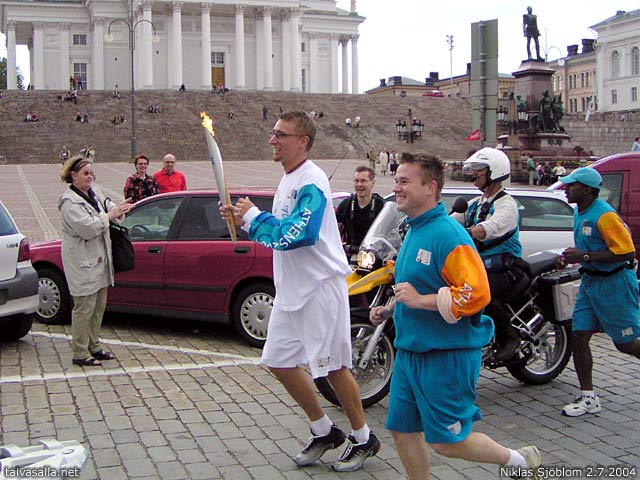 Helsinki: Ateena 2004 -olympiasoihtuviesti Senaatintorilla, viestinviejänä salibandytähti Janne Tähkä.