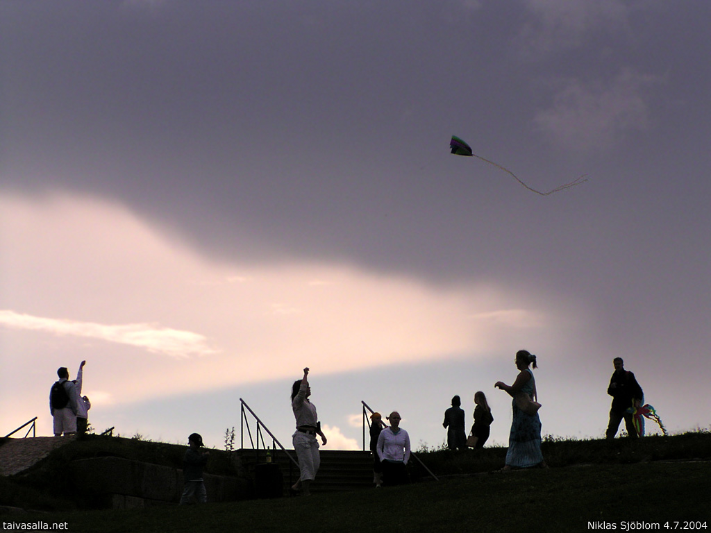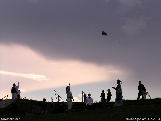 Helsinki: Leijan lennätystä Leijat Kaivarin yllä -tapahtumassa Kaivopuiston huipulla hieman ennen sateen alkamista.
