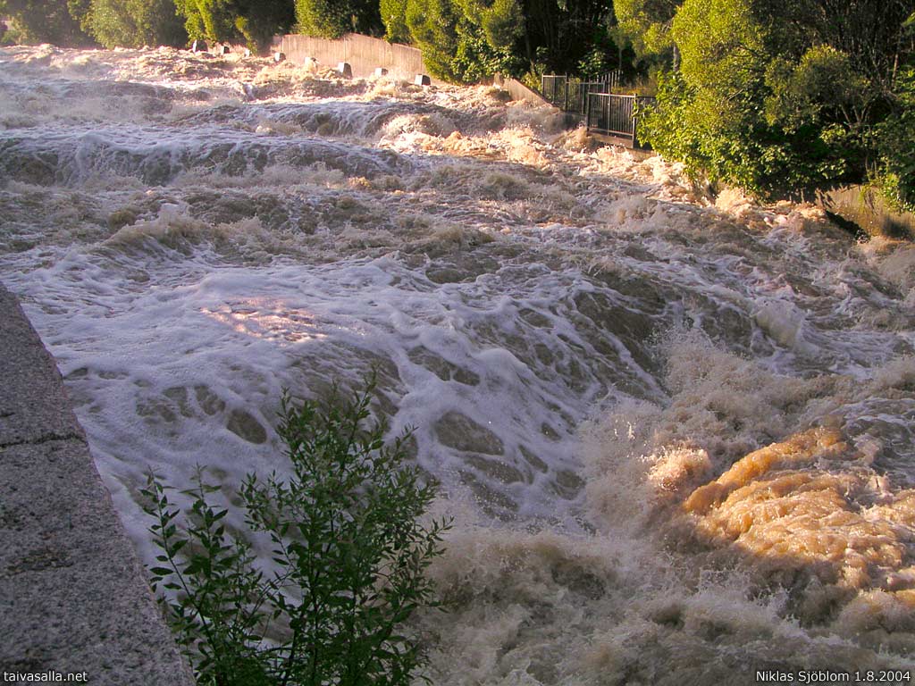 Helsinki: Vanhankaupunginkosken kuohuja Vantaanjoen suulla Vanhassakaupungissa. Heinäkuun lopun runsaat sateet saivat Vantaanjoen paikoin tulvimaan.