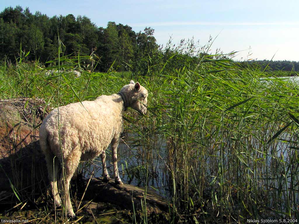 Helsinki: Lammas ihmettelee vedenpinnasta heijastuvaa peilikuvaansa Mustasaaren rannassa Lauttasaaren pohjoispuolella.