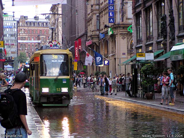 Helsinki: Aleksanterinkatu tulvii kaupungin ylittäneen ukkosrintaman aiheuttamien rankkasateiden jälkeen. (Katso myös edellinen kuva ja HS:n kuva.)
