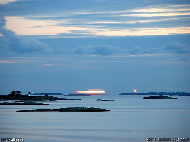 Hanko: Saksan Rostockiin Hangosta klo 22 lähtenyt Superfast ferries -varustamon alus on juuri ohittanut Russarön majakan. Kuvattu Högholmenin rannasta Tvärminnessä.