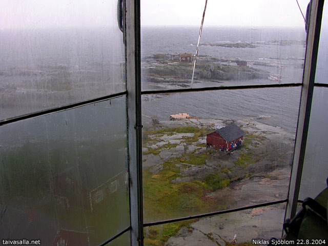 Porvoo: Sateen ja huurustuneiden ikkunoiden sävyttämä näkymä Söderskärin majakan huipulla sijaitsevasta lyhtyhuoneesta, jossa sijaitsee majakan valolaitteisto.