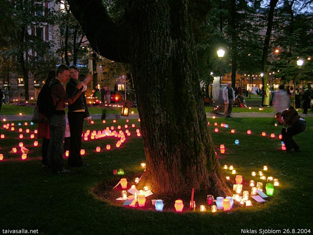 Helsinki: Kynttilälyhtyjen loistoa Vanhassa kirkkopuistossa Taiteiden yönä. Hetkeä myöhemmin alkoi tunnelman synkentänyt sade.
