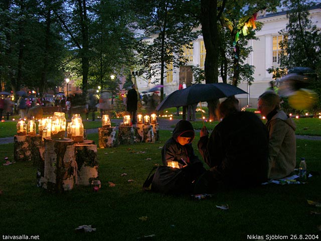 Helsinki: Kynttilöiden valaisemassa Vanhassa kirkkopuistossa kirjoitettiin kortteja sateenvarjojen alla Taiteiden yönä. Juuri alkanut sade ei vielä ollut sammuttanut kynttilöitä.