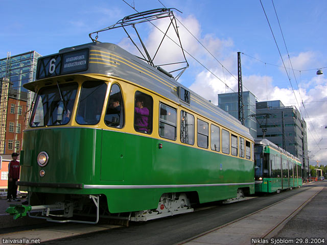 Helsinki: Hiljattain museovaunuksi entisöity ratikka 339 avasi raitiolinjan 6 uuden reittiosuuden Arabianrannassa. Takana klo 9.00 lähtenyt ensimmäinen varsinainen linjaliikennevaunu.