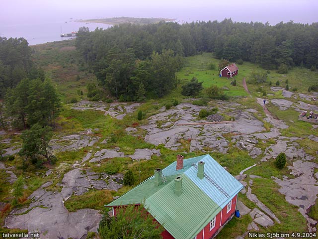 Luvia: Näkymä majakkatornista länsiluoteeseen Säpin saaressa Selkämerellä. Etualalla entisen majakanvartijan asuintalo, taustalla vasemmalla saaren ainoa kelvollinen rantautumispaikka.