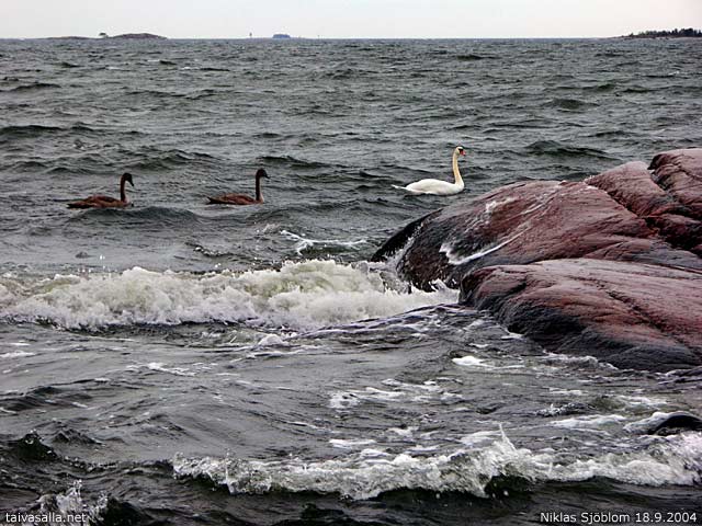 Helsinki: Kyhmyjoutsen poikasineen Lauttasaaren kaakkoisrannan aallokossa.
