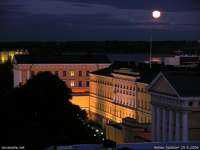 Helsinki: Ulkoasiainministeriö Katajanokan Merikasarmissa ja parikymmentä minuuttia aiemmin noussut täysikuu. Kuvattu ullakkoikkunasta Vyökadulla.