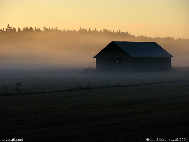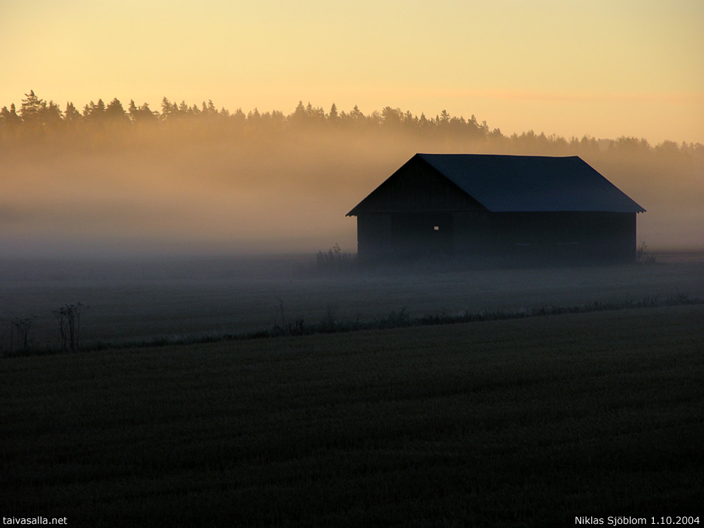 Pyhtää: A shed on a foggy field near Heinlahti bay in Pyhtää commune; southeastern Finland. Picture taken on a clear and calm autumn morning.