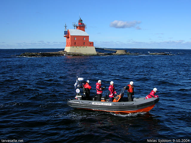 Kirkkonummi: Porkkalan majakka Kallbådan luodolla. Vaikeapääsyiselle luodolle rantautuminen ei merenkäynnistä johtuen onnistunut Porkkalan meripelastajien pienellekään veneellä.