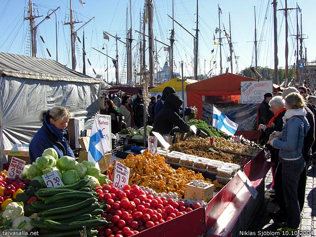 Helsinki: Aurinkoinen syyssunnuntai Kauppatorilla. Taustalla yleisölle avoimena olleiden suurten purjelaivojen mastomeri.