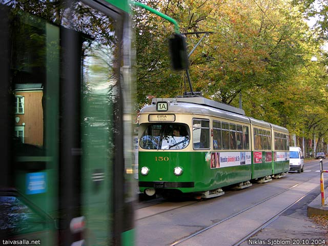 Helsinki: "Ludde", an old German tram from 1967 bought for experimental use in Helsinki, meets a modern tram on route 1A on Pohjolankatu street in Käpylä district. (See also July 5th, 2004.)