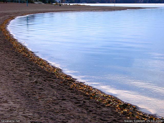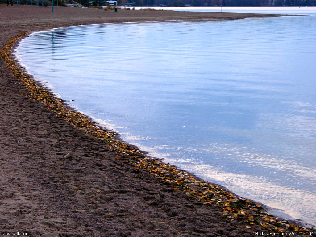 Helsinki: Meren kuljettamat lehdet reunustavat Hietaniemen autiota uimarantaa syysillan hämärtyessä.