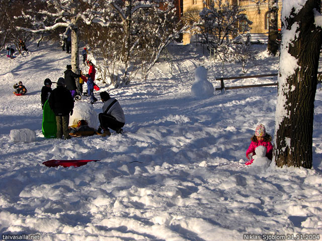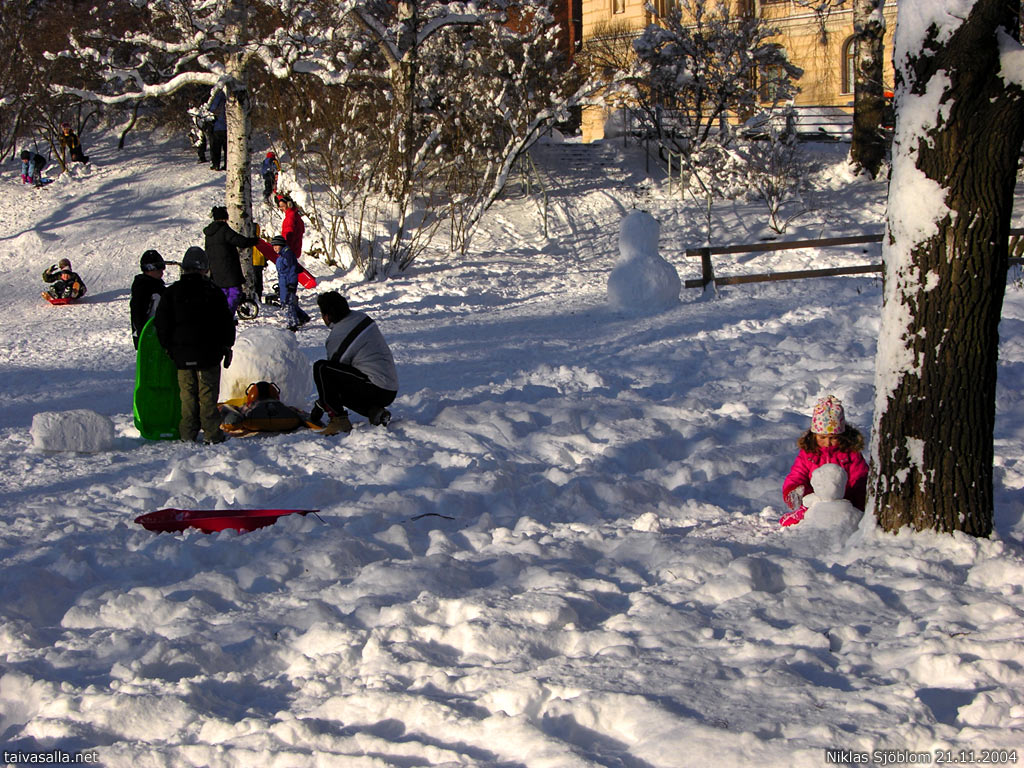 Helsinki: Families with children spending the holiday in the snowy park of Katajanokka district. Heavy snowfall followed by sunshine turned the city to a true winter wonderland.