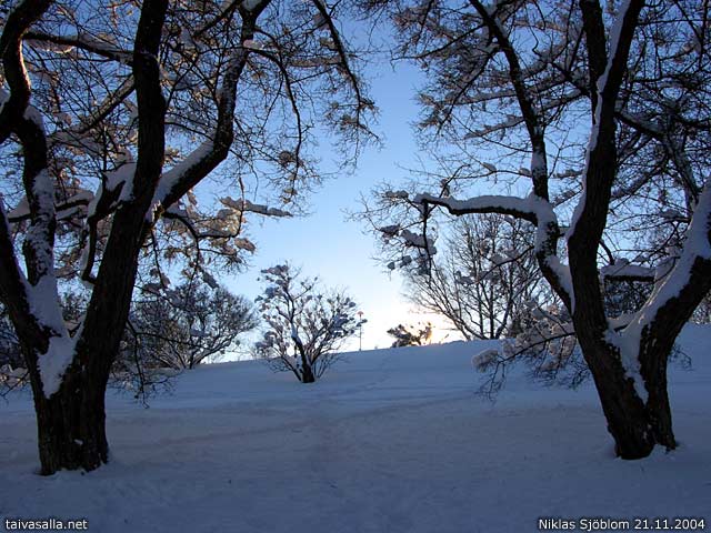 Helsinki: Snowy view from Tähtitornin vuori (Observatory Tower Hill); Ullanlinna district.