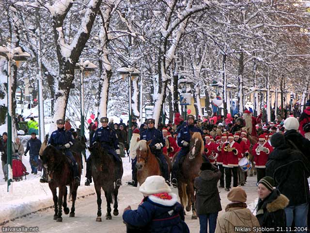 Helsinki: Opening ceremony of Aleksanterinkatu Christmas street; parade on the snowy Pohjoisesplanadi street in the city centre.