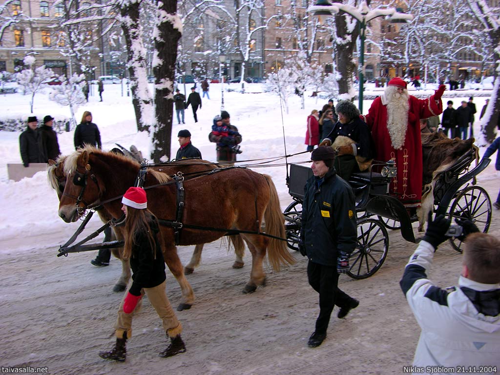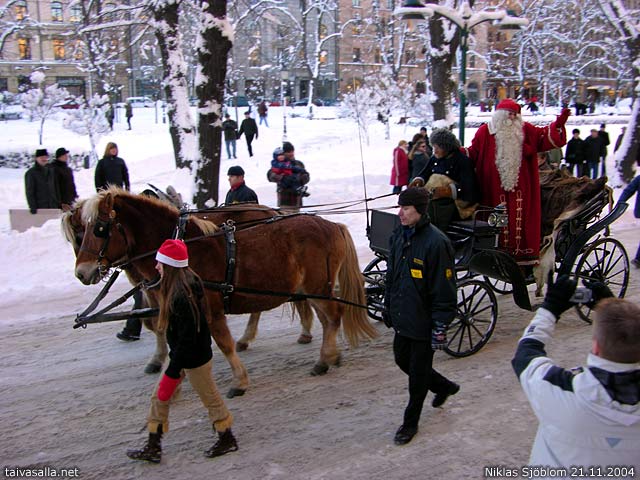 Helsinki: Opening ceremony of Aleksanterinkatu Christmas street; Santa Claus participating in a parade on the snowy Pohjoisesplanadi street in the city centre.