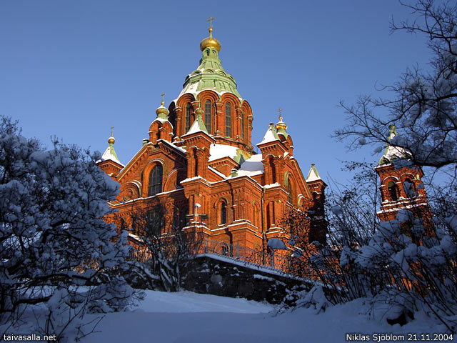 Helsinki: The Uspenski Cathedral and a snowy landscape in the district of Katajanokka.