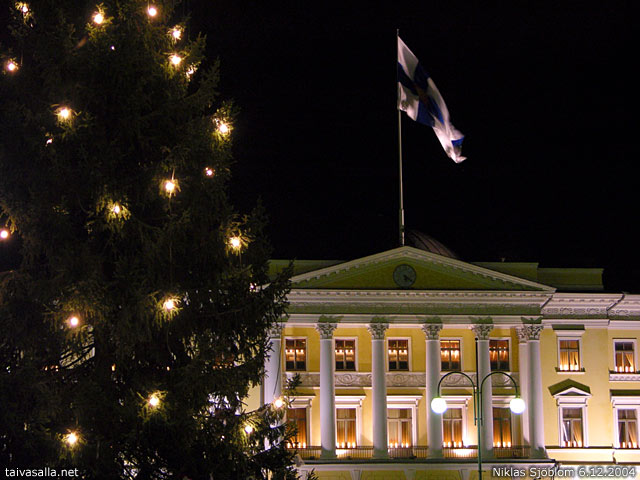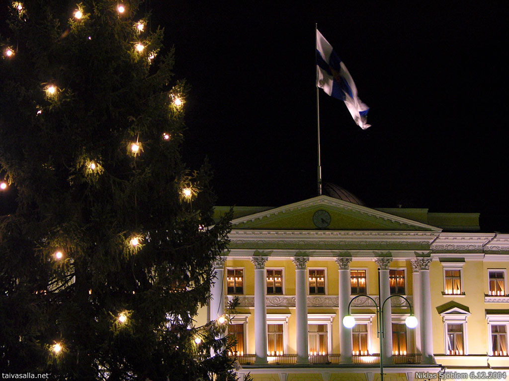 Helsinki: The Government Palace and a Christmas tree. View from the Senate Square on Finland's Independence Day.