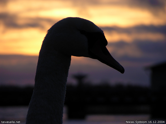 Helsinki: A mute swan on the shore of Humallahti bay at sunset. Picture taken nearby Merikannontie street in Taka-Töölö district towards Lauttasaari island district.