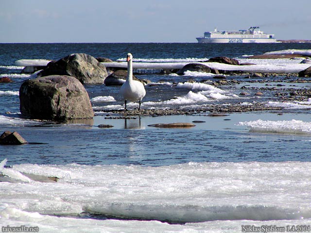 / Helsinki: A mute swan and Silja Line's M/S Finnjet approaching the city; view from the southeastern coast of Lauttasaari island district.