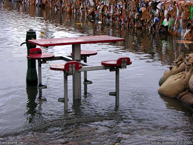 Helsinki: Kahvittelupöytä saapasjalkaisille Kauppatorilla. Itämeren myrskyn nostattamia tulvavesiä torjuttiin vesipumpuilla, hiekkasäkeillä ja taustalla näkyvällä jätepahvimuurilla.