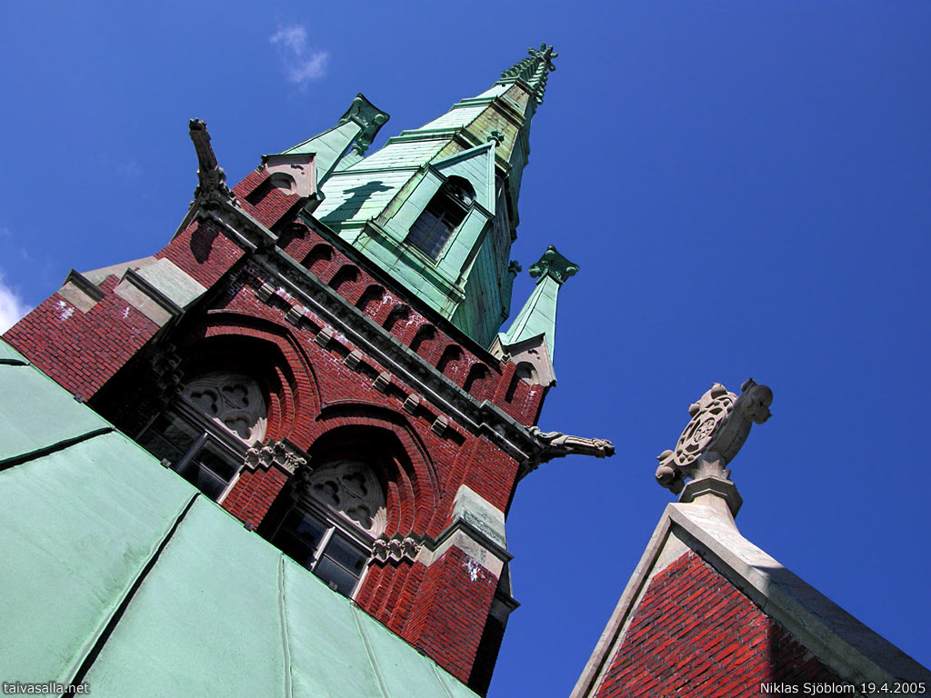 Helsinki: Northern tower of St. John's Church in Kaartinkaupunki district seen from between the two towers. The "dragon" pointing to the right appeared also in the previous picture.