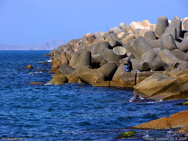Kreeta, Kreikka: Mies ongella satama-aallonmurtajalla Iraklionissa, Kreetan pääkaupungissa. Taustalla näkyy Kreetanmerestä kohoava Dian saari, joka esiintyy myös aiemmissa kuvissani.