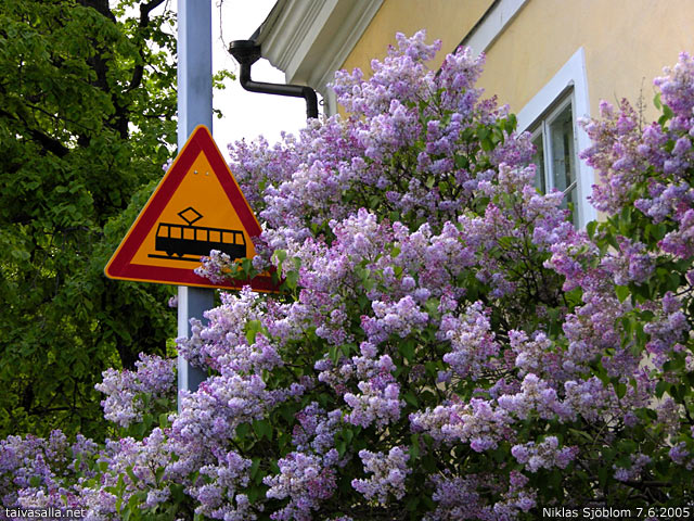 Helsinki: Kukkiva syreeni ja sen kulmikas vierustoveri kilpailevat huomiosta Aleksanterinkadulla, lähellä Mariankadun risteystä Kruununhaassa.