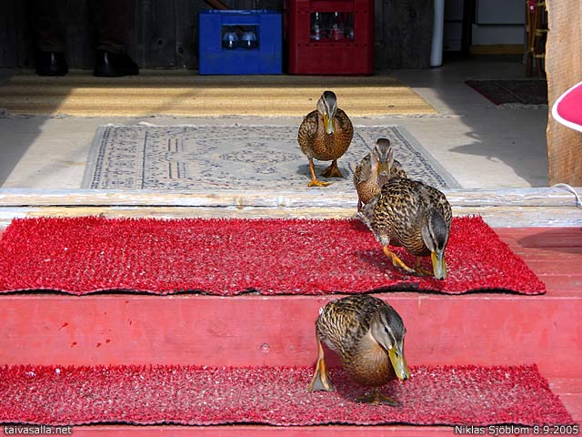 Helsinki: A brood of ducks leaving Regatta, a small cafeteria on the shore of Taivallahti bay in Taka-Töölö district. After taking a short dip in the sea the birds returned to the cafeteria.