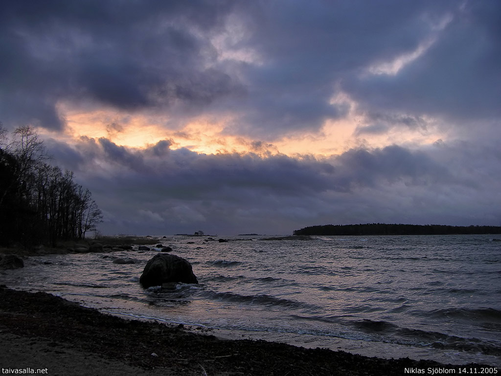 Helsinki: A crack in the clouds let a little light through before a rainy and windy autumn day. Picture taken on the southern shore of Lauttasaari island about 15 minutes after sunrise.