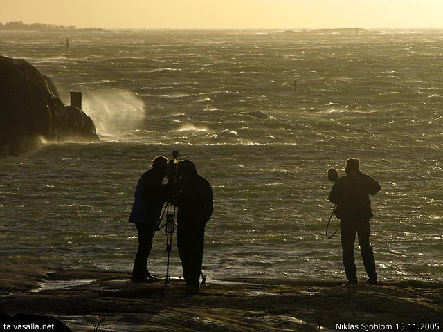 Helsinki: Cameramen filming a stormy sea landscape for the viewers of the Finnish television channel MTV3. Picture taken on the shore of Kaivopuisto district towards the Gulf of Finland.
