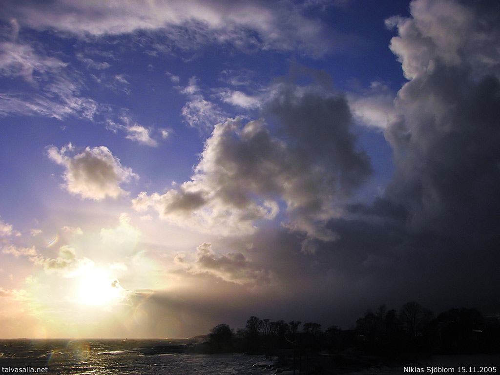 Helsinki: Taivas Suomenlahden yllä kuvattuna Kaivopuiston rannasta hetkeä ennen sadetta. Pilvipeite repeili, kun syysmyrskyn aiheuttaneen matalapaineen keskus ohitti Etelä-Suomen.