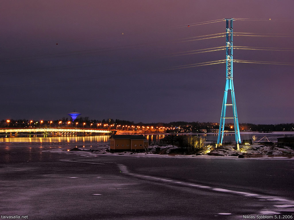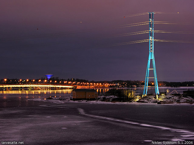 Helsinki: Juhlavalaistu Antin askeleet -voimalinjan maisemapylväs kohoaa Ourit-saaren kärjessä Lapinlahden rannassa. Hietaniemen hautausmaalta otetussa kuvassa taustalla Lapinlahden silta.