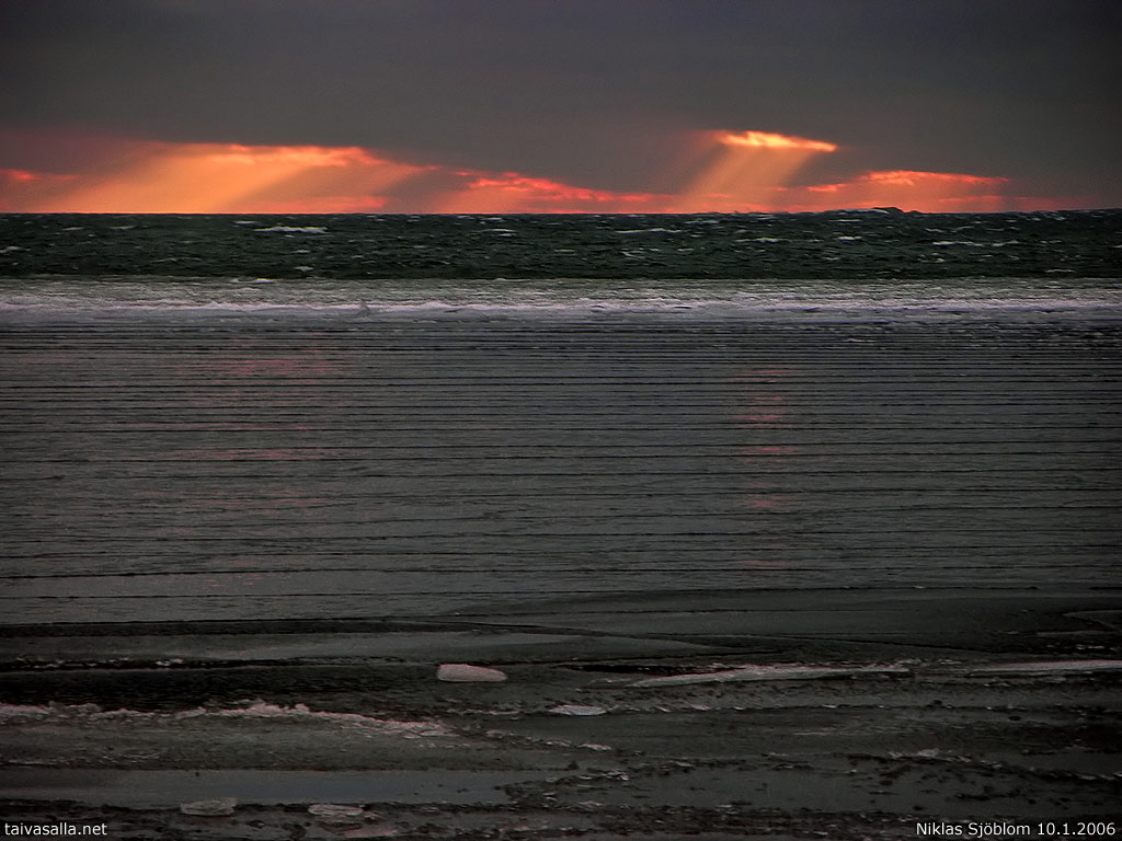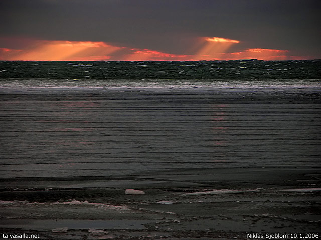Kaipasin paikan päällä parempaa zoomia, jotta olisin saanut yksityiskohtaisemman kuvan horisontissa näkyvistä auringonsäteistä. Toisaalta rannalla tuuli niin kovaa, että vankka jalusta kameralle olisi siinä tapauksessa ollut välttämätön. Muutenkin sellaisesta olisi ollut apua.