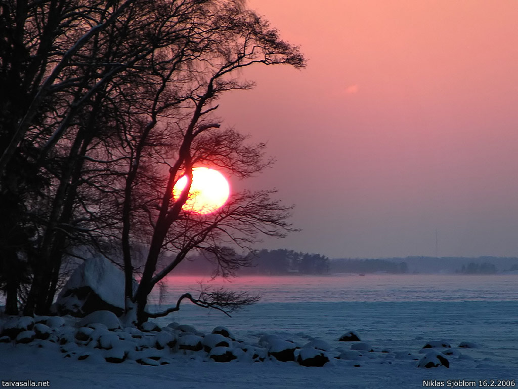 Helsinki: Laskeva aurinko Särkiniemen pohjoisrannan takana Lauttasaaressa. Kuvattu Länsilahden rannalta kymmenen minuuttia ennen auringon painumista mailleen.