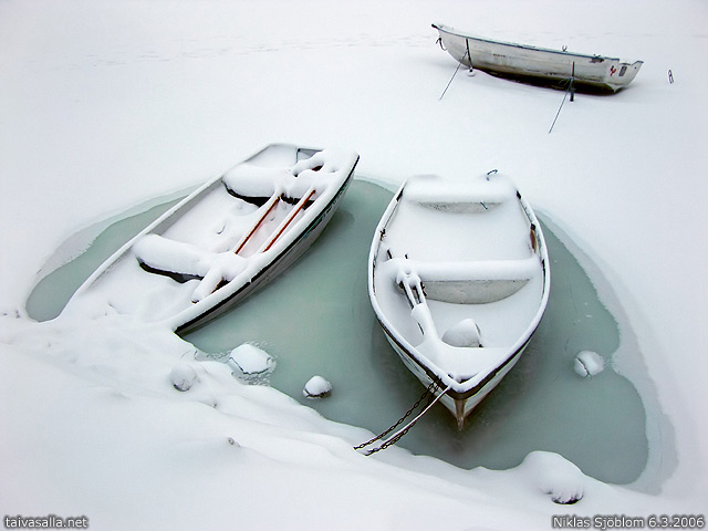Oi, tämä on tosi hieno! Lumi näyttää maitomaiselta, hämmästyttävä efekti. Nuo kaksi venettä ovat jotenkin onnellisemmassa asemassa, omassa pikku lätäkössään, verrattuna takimmaiseen, joka kääntää vaivalloisesti kylkeään hangessa.