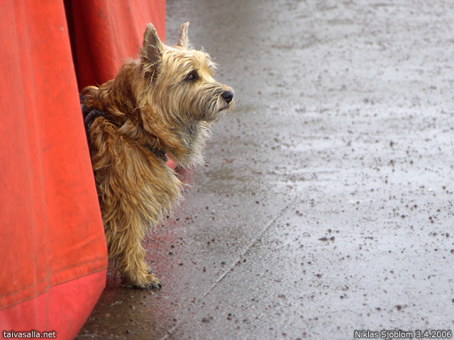 Helsinki: Koiranilmaa paossa kalakauppiaan teltalla Kauppatorilla.