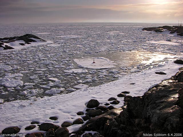 Helsinki: A bathing beach between Kustaanmiekka and Susisaari, two of the Suomenlinna sea fortress islands. A glimpse of the sun was seen despite occasional snow showers.