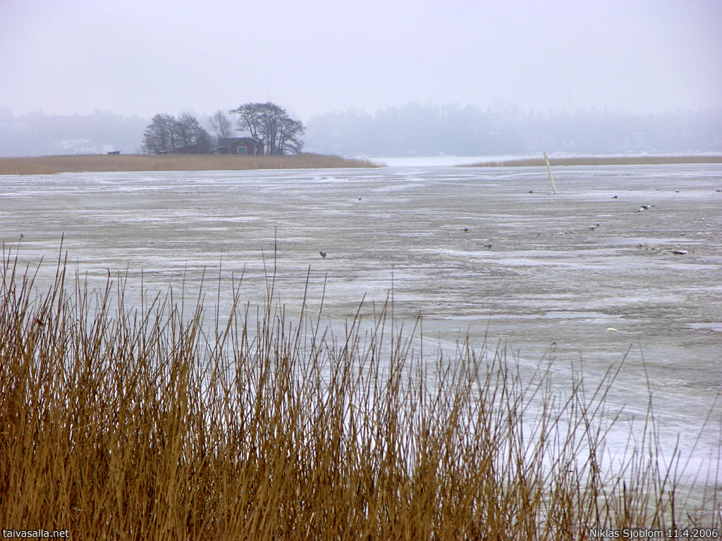Helsinki: Vanhankaupungin selkä sea area and its melting ice cover seen from Vanhakaupunki district. The little island, Kokkoluoto, is also visible in a picture taken on January 20th, 2006.